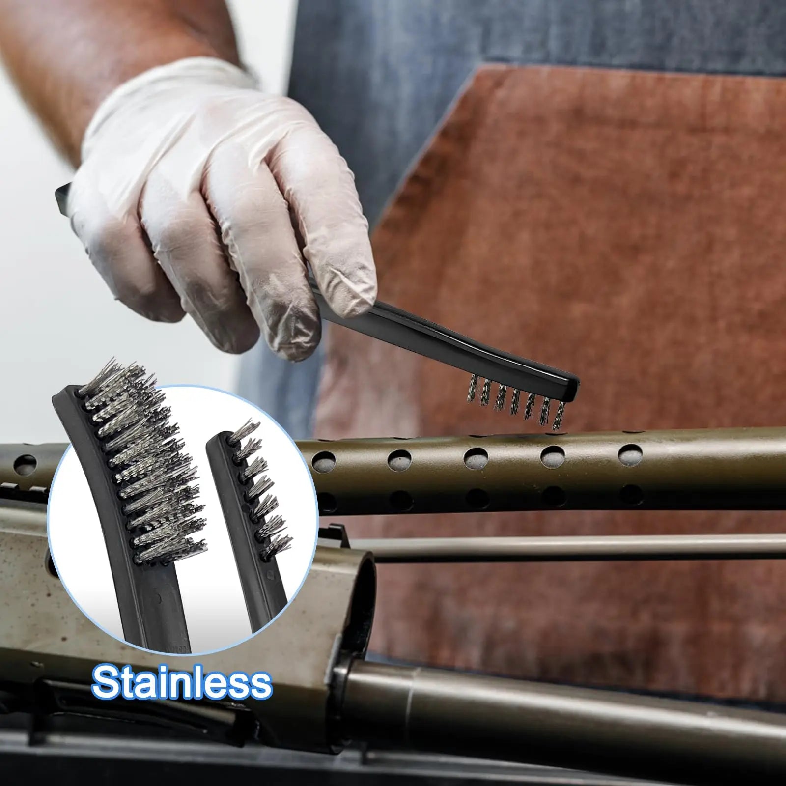 4.Die Nylonbürste eignet sich perfekt für Triggergruppen, Kleinteile und Gleitschienen. Die Stahlbürsten können in besonderen Situationen verwendet werden.