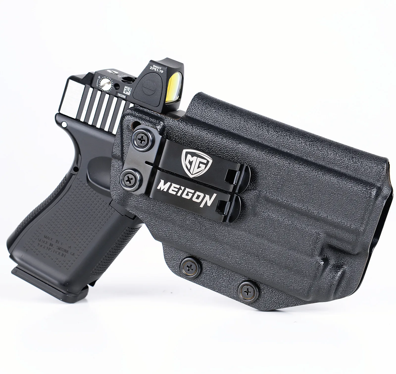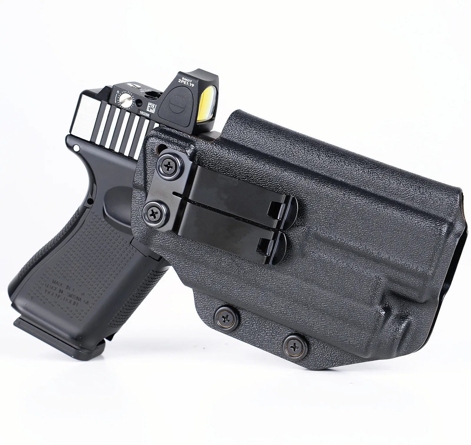 „TIGGER-SCHUTZ & „POSI-CLICK“-DESIGN:“Das Kydex-Triggerschutzdesign bietet eine vollständige Abdeckung des Auslösers und verhindert so ein versehentliches Einführen der Finger und verhindert so mögliche Unfälle.und Sie können die Pistolenverriegelung „KLICKEN“ hören, wenn Sie sie in das Holster stecken, was darauf hinweist, dass sie fest sitzt.