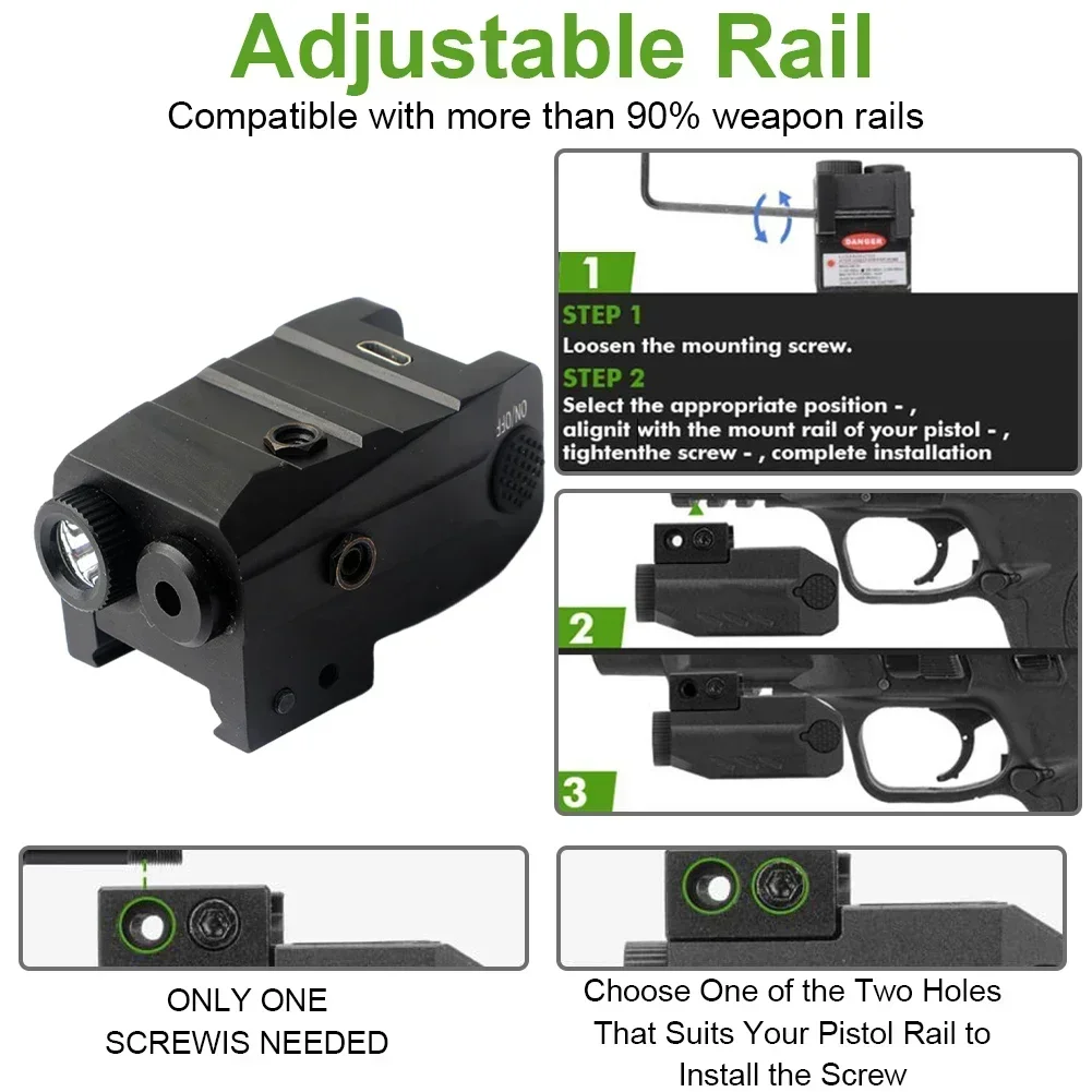 * 2. [Zwei vielseitige Einstellungen] Taschenlampe beinhaltet Steady/Strobe-Modi. Arbeits modi: Steady/Strobe Taschenlampe, nur Laser, Steady/Strobe Taschenlampe + grün/rot Laser, grün/rot Laserstrahl für Pistole kann vertikal und horizontal eingestellt werden. Das Paket enthält einen kleinen Schraubens chl üssel, der in das Loch eingeführt werden kann, um die Genauigkeit des grünen Punktes einzustellen.